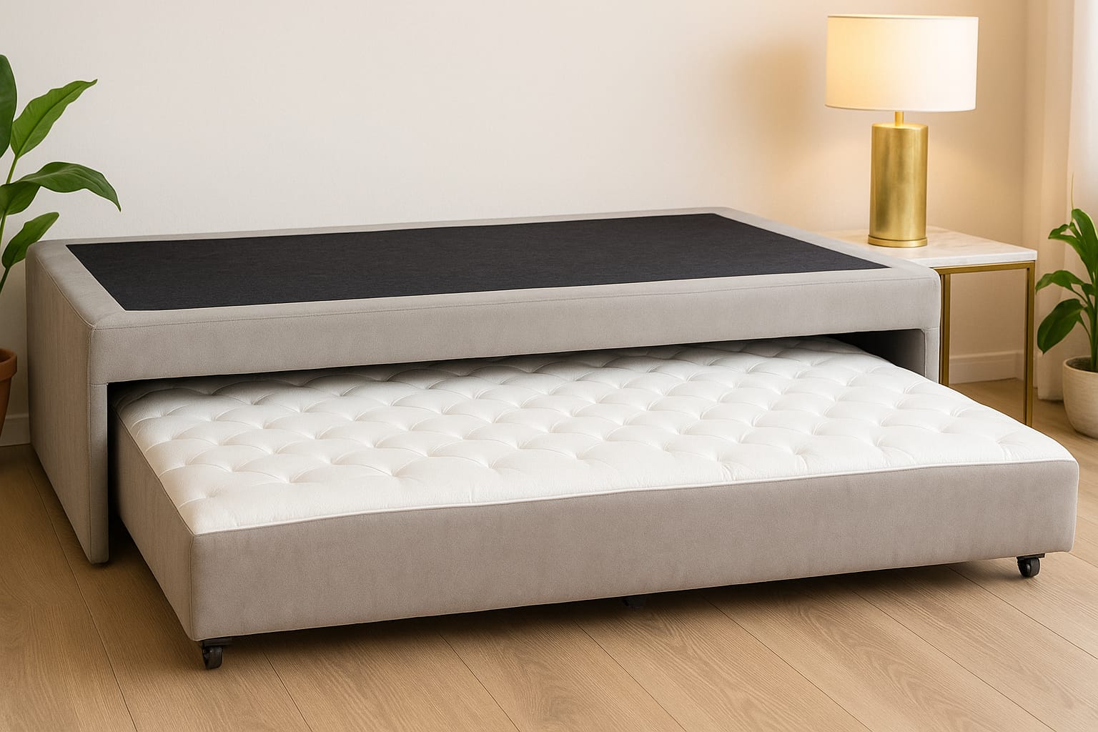 Cama Divan fabricada en madera de pino reforestada, cepillada e inmunizada, lo que garantiza durabilidad, resistencia y un compromiso real con la sostenibilidad. Está tapizado con tela de tejido continuo con propiedades que la hacen resistente, amigable con mascotas, de fácil limpieza y sin pérdida de color; complementado con patas de madera que aportan calidez y un acabado natural y sofisticado. Su diseño incluye una cama superior y una cama inferior deslizable, perfecta para habitaciones infantiles, de huéspedes o espacios reducidos.