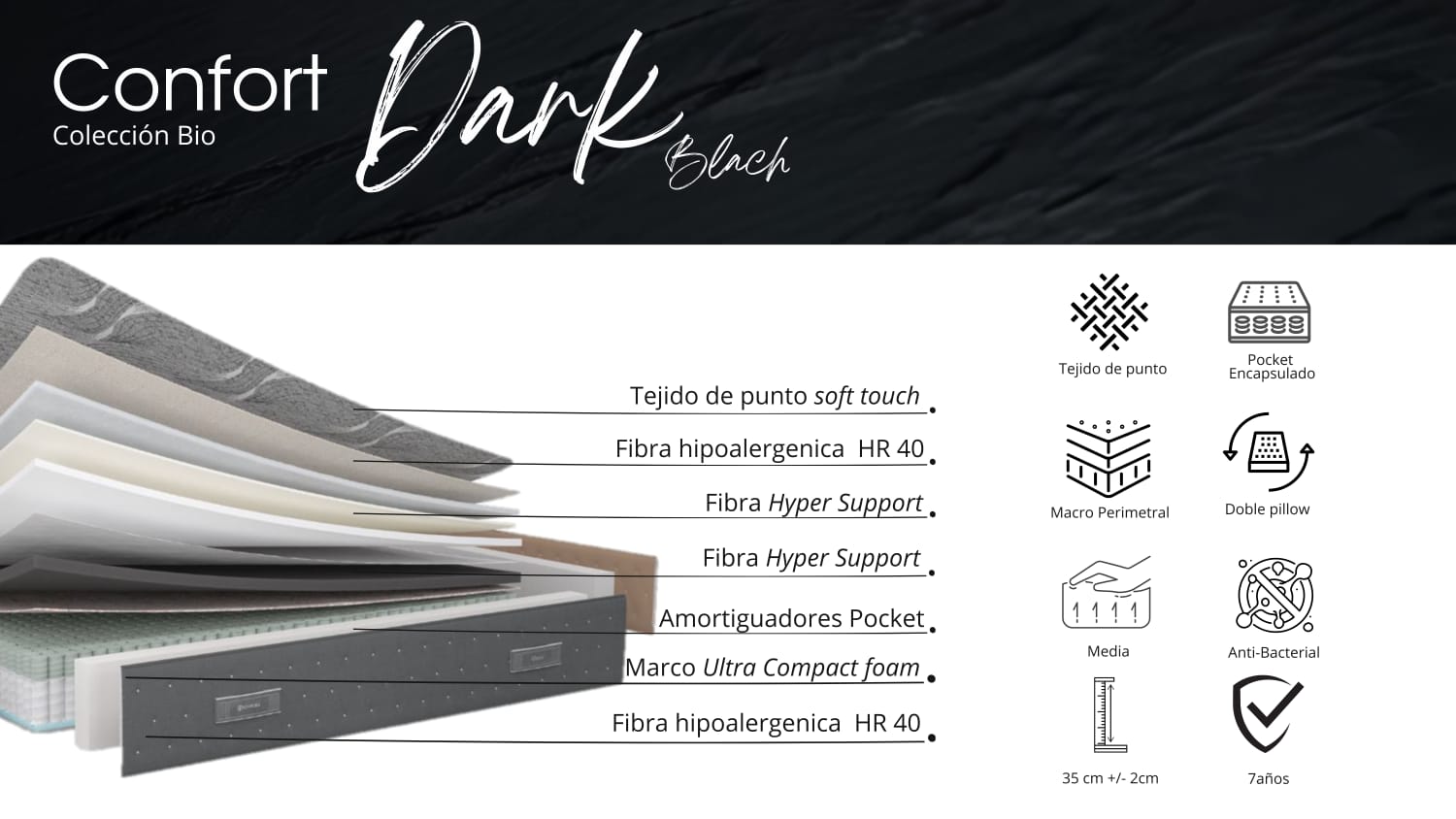 Colchón de firmeza alta de 36 cm de alto con 2+/- cm de tolerancia, que brinda soporte sin renunciar a la comodidad. En su interior, incorpora una fibra de soporte de alta densidad y un cierre estructural firme que aportan solidez y estabilidad al cuerpo. Cuenta con unidad de resortes Pocket, que distribuye el peso de forma uniforme. Su superficie, acolchada, está recubierta en tejido de punto, suave al tacto y complementada con espuma de alta densidad para una sensación de soporte sin rigidez excesiva. El encajonamiento perimetral en fibras de alta densidad mejora la estructura general, mientras que la platabanda en tela lisa resistente asegura una larga vida útil.