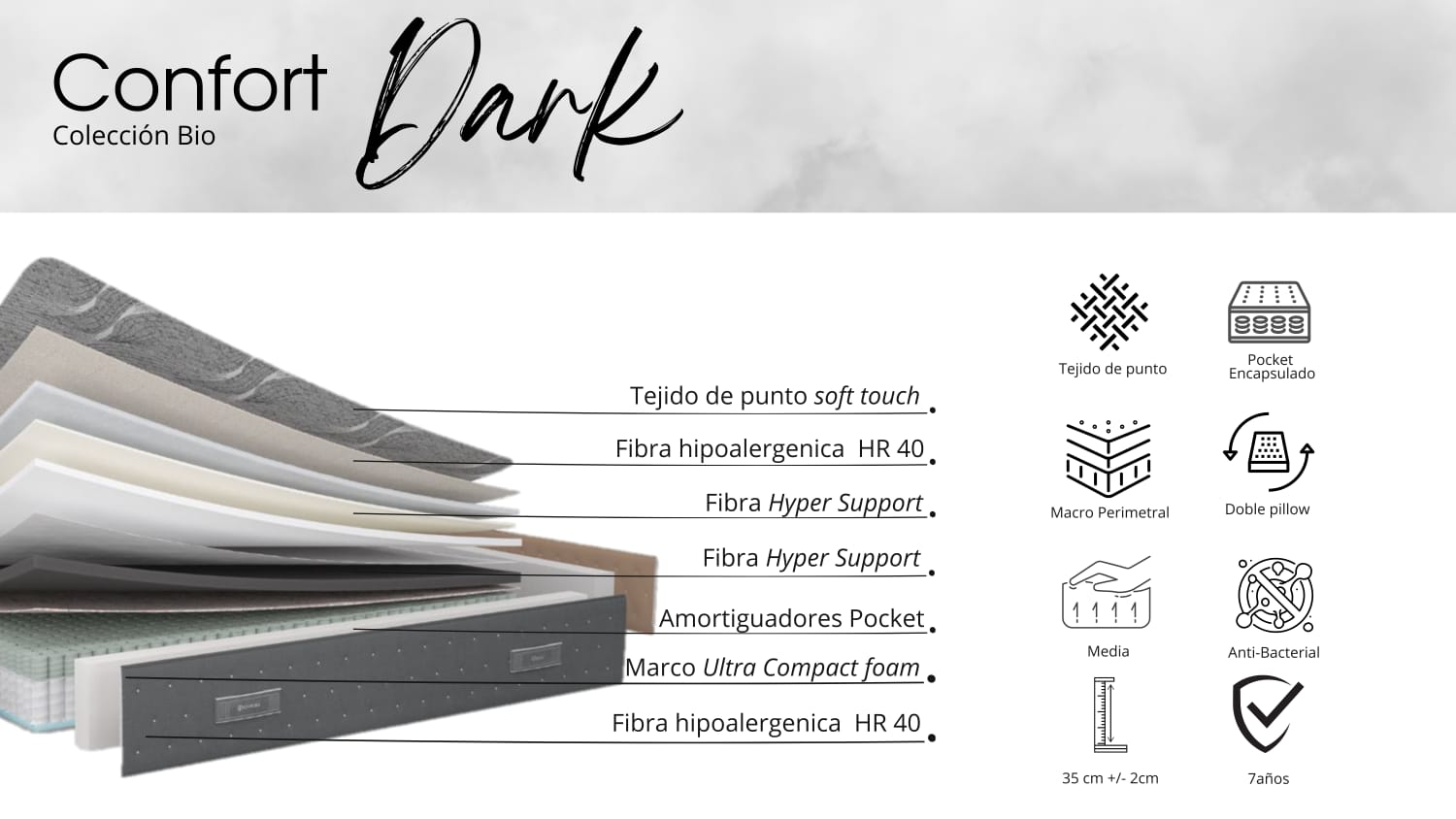 Colchón de firmeza intermedia-suave de 30 cm de alto con 2+/- cm de tolerancia. Su interior combina una fibras de soporte de densidad media con una base reforzada en espuma de alta densidad, que aporta mayor estabilidad. Incorpora unidad de resortes Bonell, brindando una sensación de soporte uniforme y confiable. La superficie está acolchada con un pillow suave, cubierto en tejido de punto y acompañado de espuma de densidad media para una acogida más confortable. El contorno está reforzado con espuma de alta densidad, y su platabanda en tela lisa resistente asegura durabilidad.