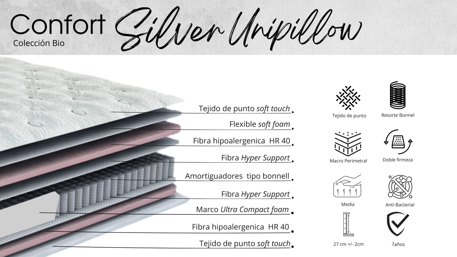 Colchón de firmeza media de 28 cm de altura con 2+/- cm de tolerancia, confortable y funcional. Compuesto por una unidad resortada Bonell que brinda soporte uniforme y mayor durabilidad, ideal para mantener una correcta postura lumbar. Incorpora fibra perimetral de alta densidad que cierra la estructura brindando soporte y evitando deformaciones en sus laterales. Su interior cuenta con láminas de fibra de soporte medio, que suaviza la sensación de contacto sin comprometer la firmeza y su pillow superior en tejido de punto acolchado ofrece una sensación confortable, y gracias a su tapa inferior en tela Jacquard, este modelo puede usarse por ambos lados.
