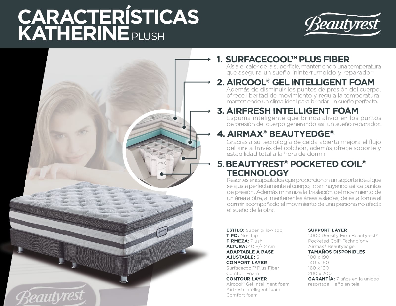 Colchón de 40 cm de alto con 2 Cm +/- de tolerancia de firmeza intermedia. Es colchón de alta tecnología ofrece una sensación envolvente ya que combina materiales inteligentes para ofrecer un descanso profundo y reparador. Su sistema de soporte está conformado por resortes encapsulados Beautyrest® Pocketed Coil®, que se adaptan de forma individual al cuerpo, reduciendo puntos de presión y minimizando la transferencia de movimiento. Su tela superior, incorpora fibras SurfaceCool, que aíslan el calor de la superficie para mantener una temperatura ideal durante el sueño. Cuenta además, con espuma AirCool® Gel Intelligent Foam proporciona confort, frescursa y libertad de movimiento, mientras que la espuma AirFresh Intelligent Foam alivia puntos de presión, favoreciendo un descanso más ergonómico y la espuma AirMax® BeautyEdge® mejora el flujo de aire y aporta estabilidad en los bordes.
